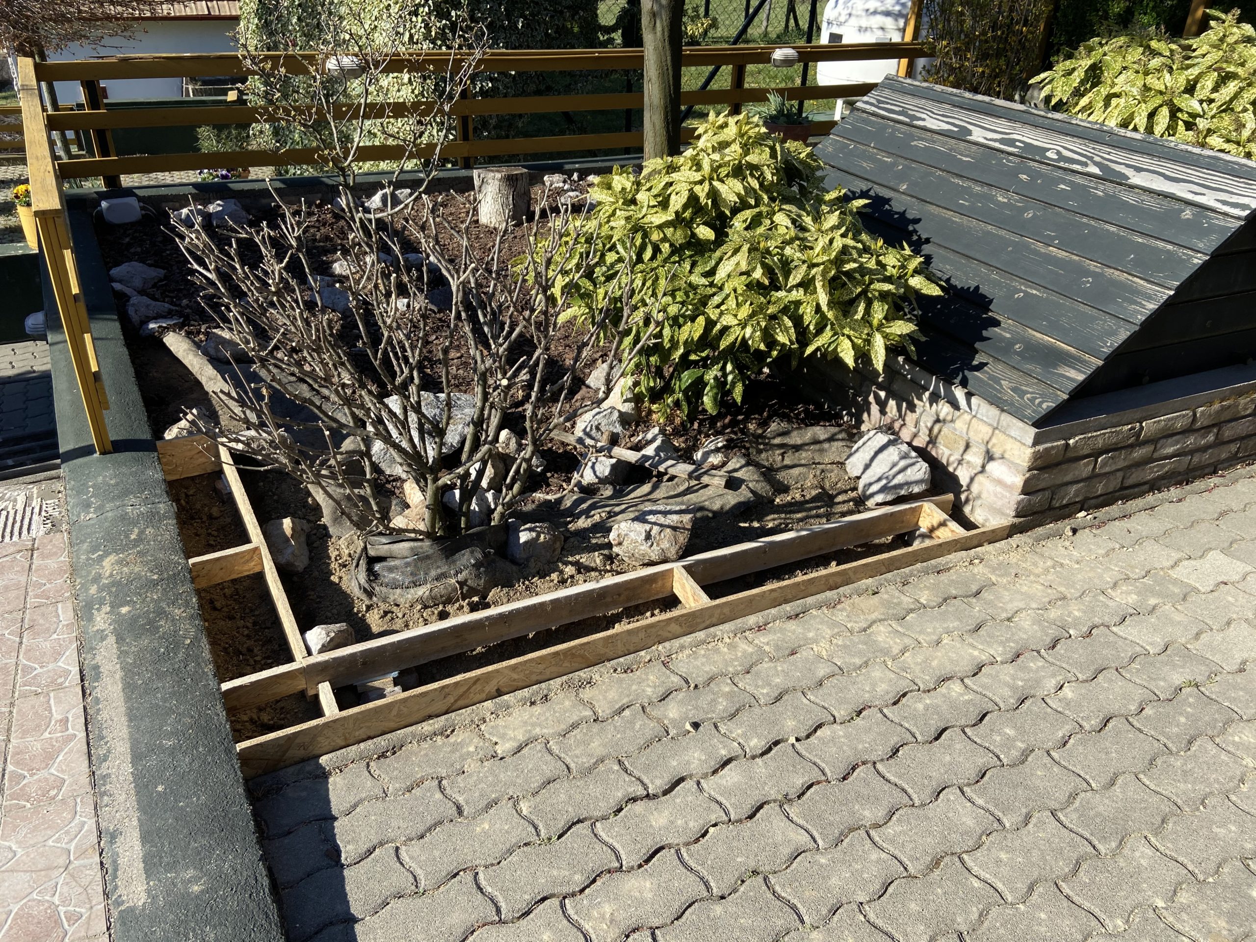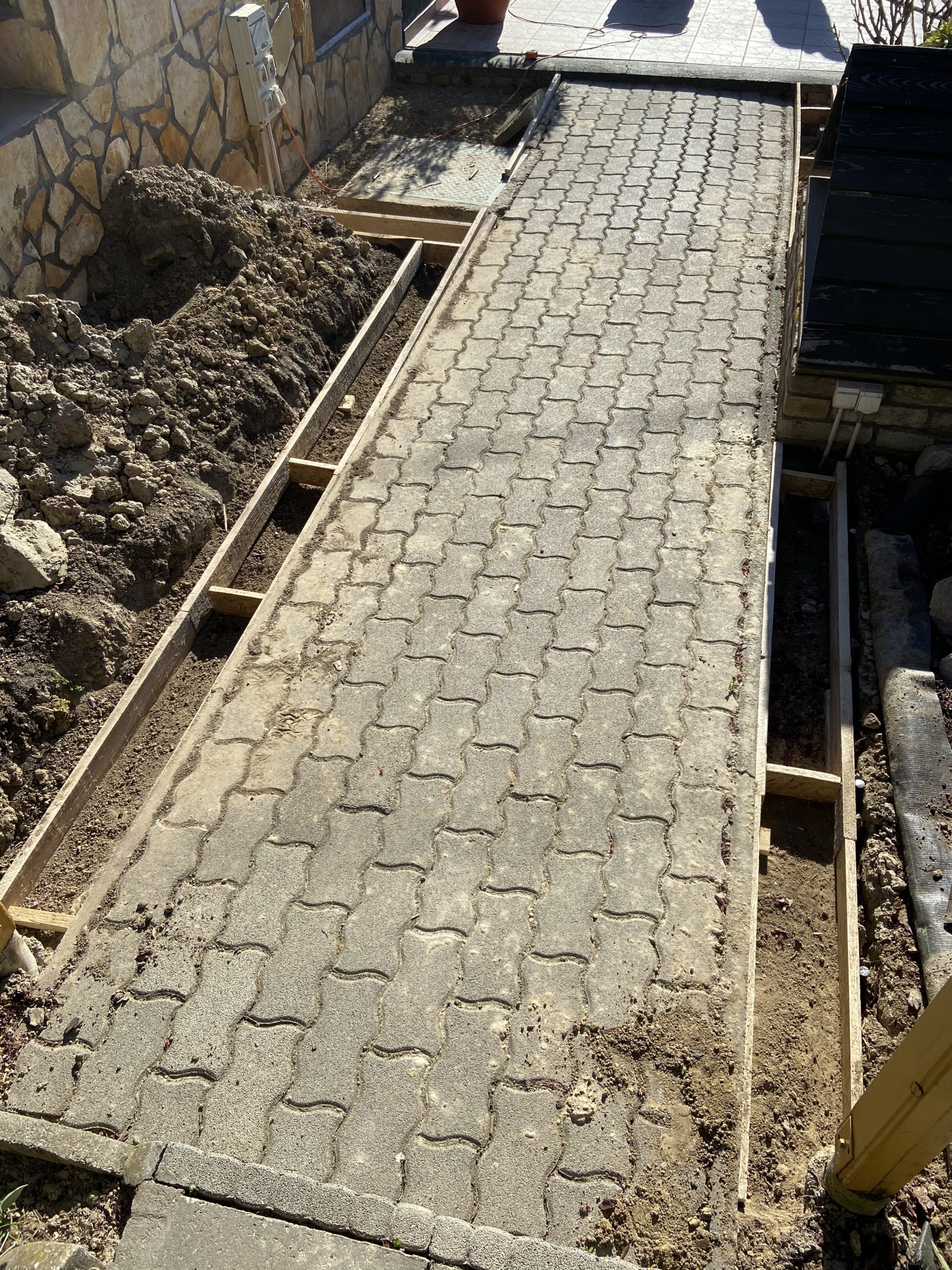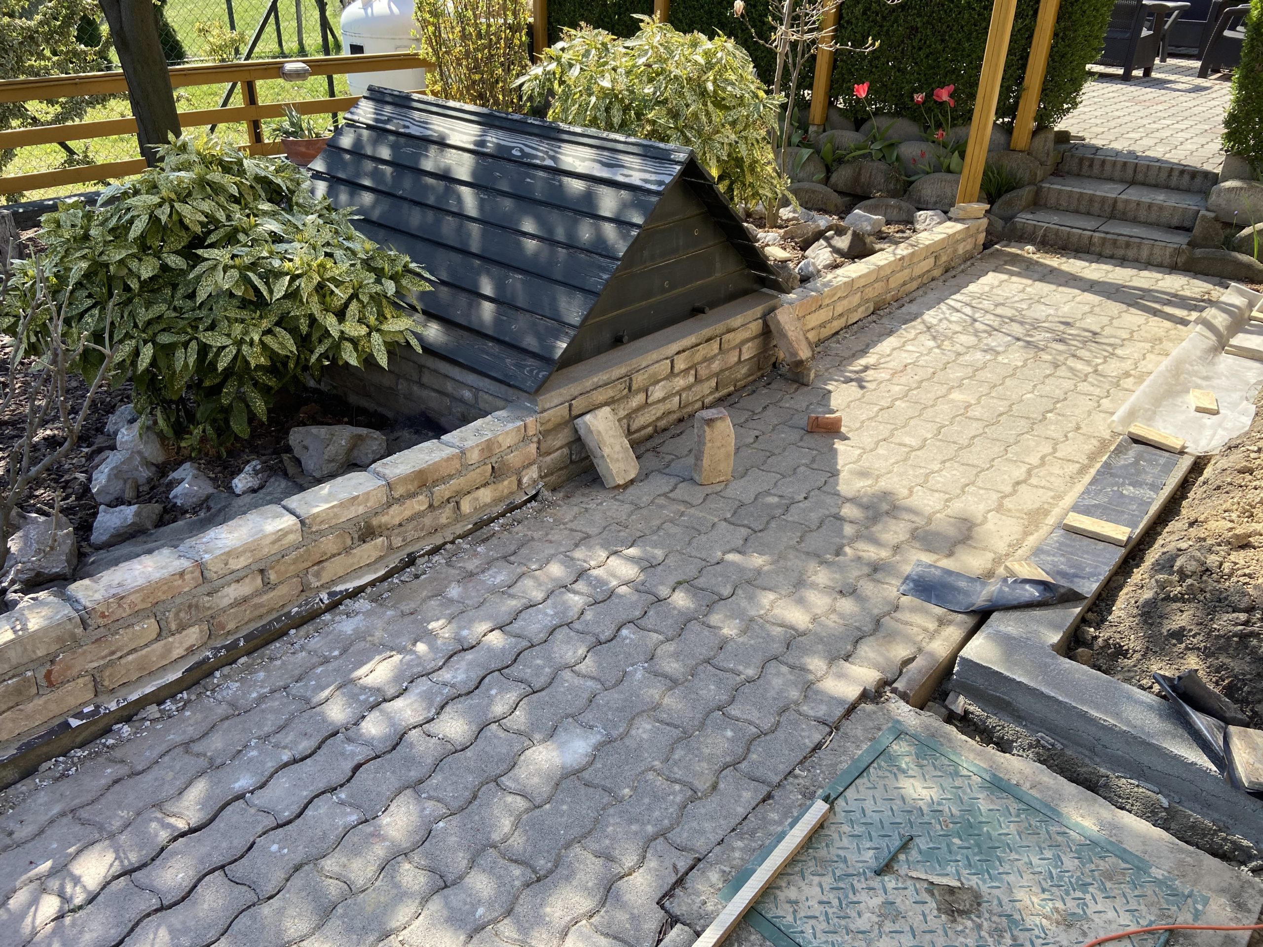 Végül a kerti dísz támfal építése bontott téglából és egyéb felületek betonozása következett.