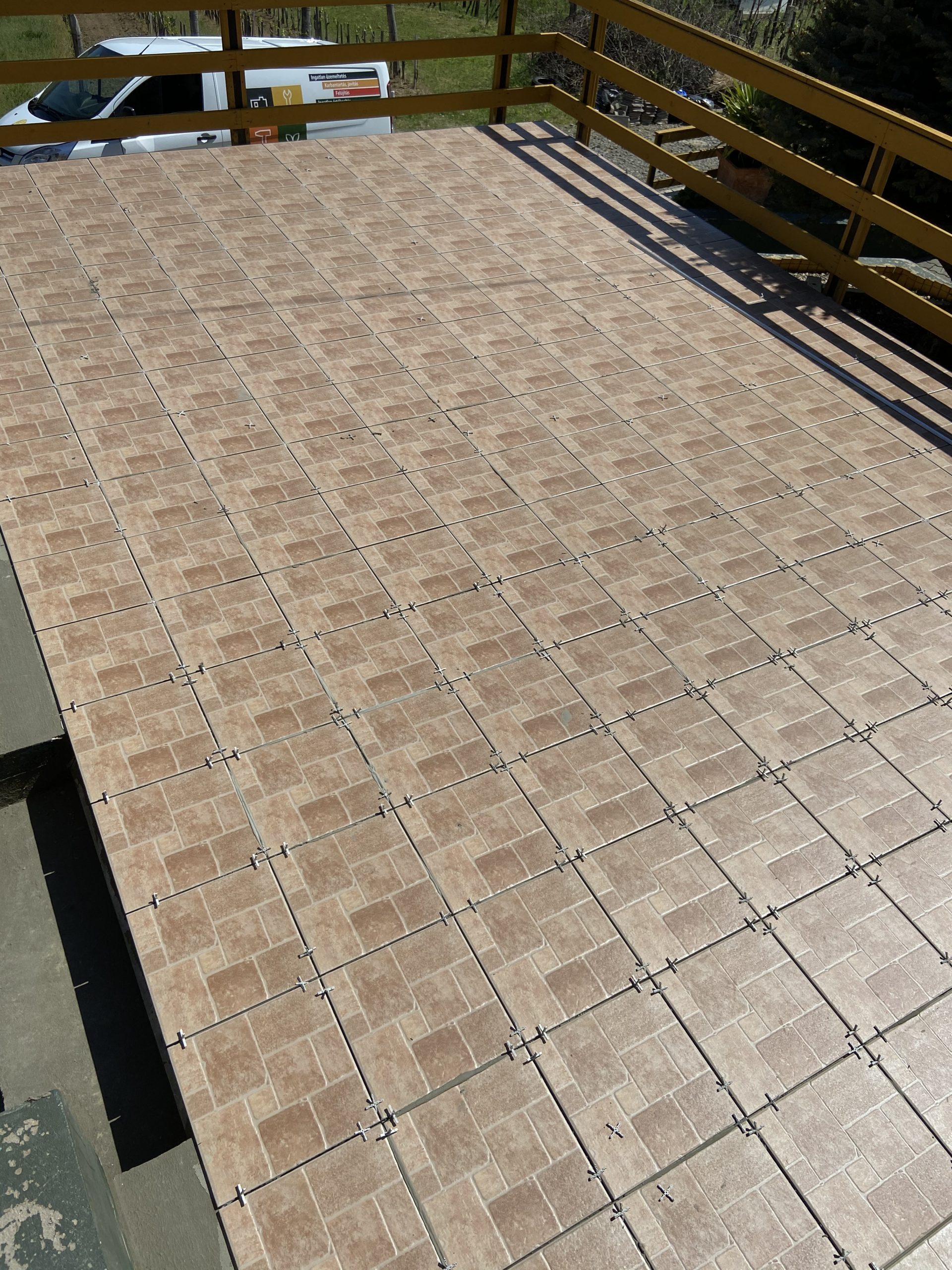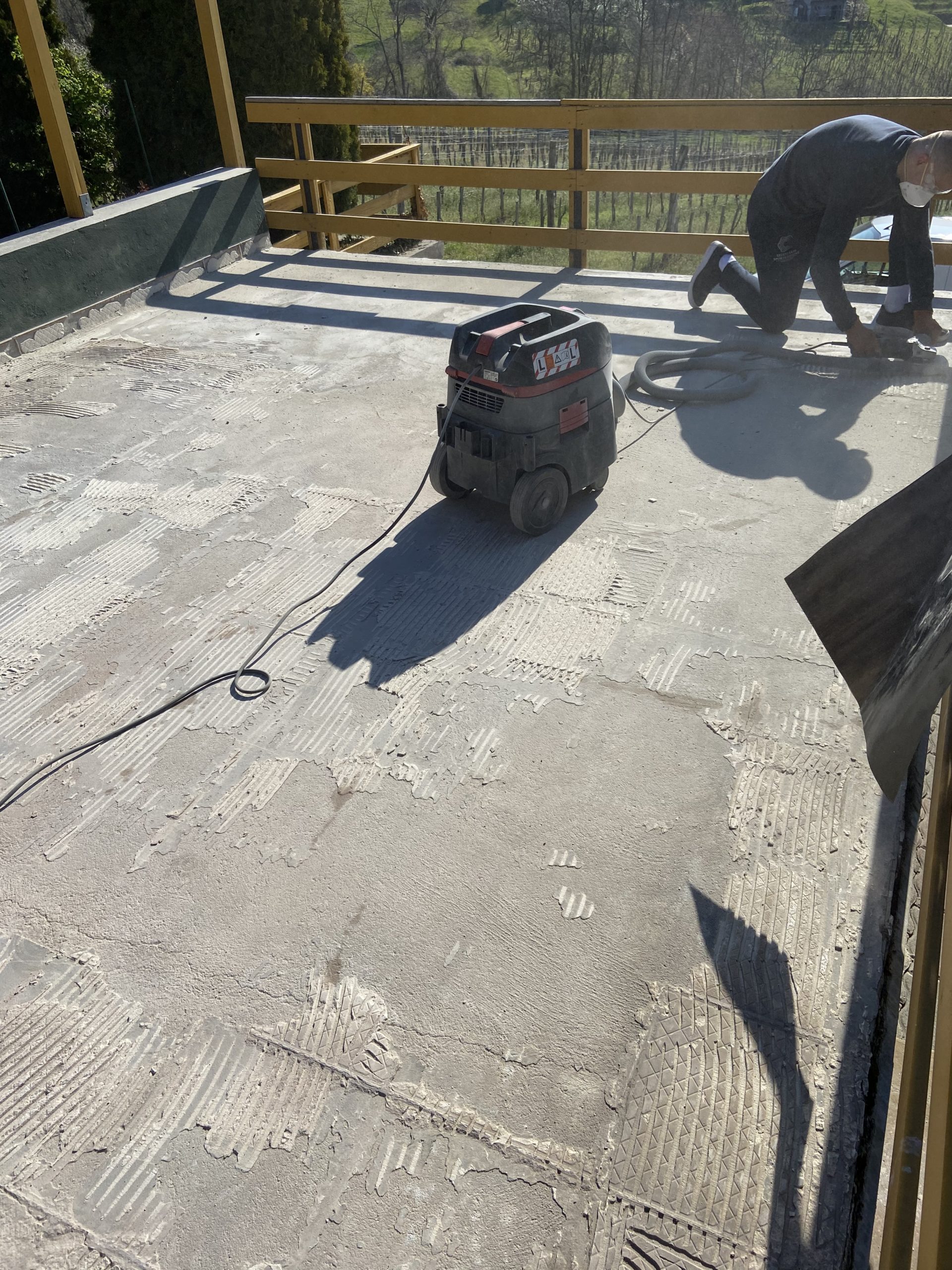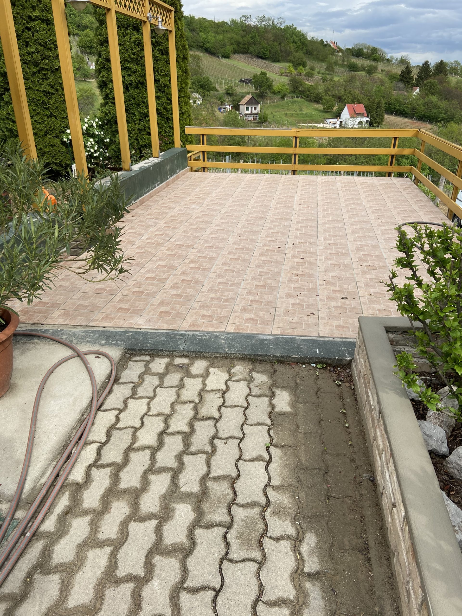 A Baka Tanya felújítása során 2019-ben a felázott teraszburkolat cseréjét végeztük el: először a régi csempét bontottuk, távolítottuk el. Ezután simára csiszoltuk a felületet, így tudtuk felvinni a vízszigetelő réteget, majd ezt hidegburkolattal fedtük.